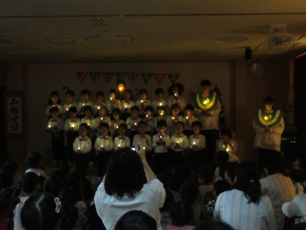 わー素敵!キャンドルを両手に持ち、曲に合わせてホールに入ってくるお友だちはいったい・・・。