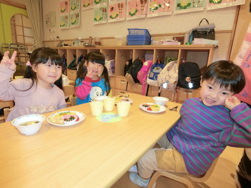さくら・かえで組、ゆり組、すみれ組、ひまわり組のみんな。